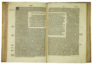 In-folio (mm 298x205). Carte [6], CXXXVIII. Qualche arrossatura e fioritura sparsa, lievi gore d'acqua marginali, svariati piccoli forellini di tarlo nel testo, poche macchie d'inchiostro nel testo, in un caso con conseguente minima lacuna, e angoli esterni delle ultime dieci carte ricostruiti. Legatura antica in piena pergamena rigida rimontata e restaurata. Numerose glosse di antica mano al testo, leggermente rifilate. Timbro di collezione privata e nota di possesso cassate al frontespizio. Prima rara edizione con il commento di Giovanni Britannico. Cfr. Adams J-749; Graesse III, 518.