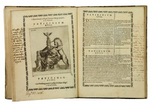 In-4° (mm 186x140). Carte [72] (mancano le ultime 2 bianche). Frontespizio inciso in rame, testo bilingue, 34 incisioni in rame, di cui 2 a piena pagina, lungo il testo. Qualche brunitura e minimi difetti al frontespizio. Legatura in mezza pergamena settecentesca con titoli in oro su tassello e fregi in oro al dorso. Antichi timbri di possesso al frontespizio, note manoscritte parzialmente rifilate ad alcune carte. Edizione che si distingue nel vasto panorama delle stampe dei Vaticinia non solo per la ricchezza e finezza dell'apparato iconografico intagliato dal Porro, ma anche perché qui è per la prima volta pubblicata la vita di Gioacchino da Fiore, tratta dal De antiquitate et situ Calabriae del francescano Gabriele Barri. Biblioteca Esoterica, 2279: «Edition très rare, avec texte bilingue, surtout intéressante pour son illustration qui comporte un titre-frontispice et 34 figures [...] toute forte curieuses et servant d'emblèmes et d'explications aux diverses prophéties de Joachim de Flore sur les Papes, parmi lesquelles la 19e Confusio et error viciabitur semble faire allusion à la Révolution française»; Caillet II, 5541 (nota).