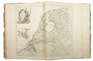 In-folio (mm 550x410). Frontespizio calcografico entro bella bordura a tema militare e 81 mappe a doppia pagina in coloritura coeva montate su brachette. Buon esemplare, con trascurabili mende: qualche lieve gora, strappetti marginali e lievi bruniture sparse; 3 mappe hanno margini più corti rispetto al resto della raccolta. Legatura muta ottocentesca in mezza pergamena con punte e piatti marmorizzati, lisa. Elenco numerato delle tavole manoscritto da mano ottocentesca al foglio di guardia anteriore con 80 rimandi (saltate le mappe Westfalia, aggiunta senza numerazione e quella della Turchia), logoro e con lacune Raccolta composita, assemblata anticamente, contenente 1 mappamondo, 4 continenti, 2 mappe del Canada e Canada e Louisiana e 74 carte dell'Europa in coloritura coeva. Sebbene il frontespizio riporti come data il 1742, le mappe sono datate variamente dal 1742 al 1757, come nell'unico esemplare censito in ICCU (che ne conta solo 40). La carta Theatre de la guerre en Silesie datata 1741 è tratta da Theatre de la guerre en Allemagne. Le restanti mappe hanno la seguente datazione: 21 sono del 1742 (le XVII Provincie dei Paesi Bassi; la Mappa dei Paesi Bassi in 6 tavole; l'Impero di Germania; il Reame di Boemia; la Moravia; il Ducato di Stiria; il Ducato di Carinzia; il Ducato di Carniola; la Contea del Tirolo; il Reame di Ungheria; Il corso del Danubio in 2 tavole; la Westfalia; l'Elettorato di Hannover; il Reame di Prussia; i Ducati di Milano, Mantova, Parma e Piacenza); 7 del 1743 (l'Alta e Bassa Alsazia; i Ducati di Lorena e Bar; il Ducato di Lussemburgo; l'Elettorato di Magonza; i territori francofoni; la Saxe contenant les routtes et les postes à Paris; l'Italia); 7 del 1744 (il Planisfero; le Isole Britanniche; la Moscovia; la Champagne divisée par elections; la Savoia; il Piemonte; la Toscana); 10 del 1745 (Inghilterra; Irlanda; Francia; Delfinato; Fiandre; Polonia; Renania; Turchia, Arabia e Persia; Lombardia, regno di Napoli); 4 del 1746 (America; Scozia; Brabante; Olanda); 5 del 1747 (Europa, Asia, Africa, Provenza, Zelanda), le restanti 26 degli anni 1753-1757.