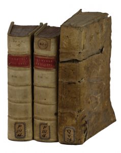 2 volumi in-8° (mm 185x115). Pagine [44], 544 con 1 ritratto calcografico in antiporta, uno al verso della dedica, una carta geografica a doppia pagina della Britannia fuori testo e altre 23 tavole calcografiche fuori testo; 592, [16] con 26 tavole calcografiche fuori testo. SI AGGIUNGE: Goselini Giuliano, Vita del prencipe Don Ferrando Gonzaga in tre libri divisa. In Milano: per Paolo Gottardo Pontio, 1574. In-4° (mm 220x155). Pagine [16], 455, [1]. Marca xilografica al frontespizio, alcuni capilettera xilografici. Parzialmente staccate le prime carte, un foro di tarlo dalla carta 3e3 al termine del volume, gore alla metà dei fascicoli. Legatura originale in piena pergamena floscia. Diverse rotture e mancanze a piatti e dorso. All'interno note manoscritte a una parte delle carte e ai contropiatti. (3). II OPERA: Prima edizione, interessante per le notizie storiche su Milano e Mantova. Lozzi 2504.