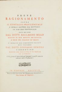 Mead Richard, Breve ragionamento sopra il contagio pestilenziale e sopra i metodi da mettersi in uso per prevenirlo. In Firenze: nella stamperia di Gaetano Albizzini, 1744.