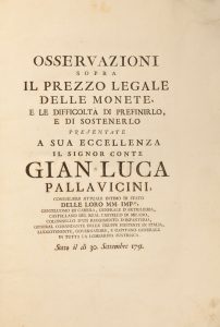 In-folio (mm 420x290). Pagine [4], 122, [176]. Splendido esemplare ad ampi margini, stampato su carta forte con solo minime tracce d'uso e rari strappetti marginali a poche carte. Legatura in cartonato coevo originale con titolo manoscritto al dorso. Minime mende. Prima edizione. L'opera, divisa in quattro parti, affronta l'argomento, molto dibattuto al tempo, del valore reale della moneta, di come stabilirlo e di come esso vari in base alla piazza monetaria presa ad oggetto. Il motivo che aveva portato l'Autore a redigere tale trattato era di tipo pratico (voleva tentare di far raggiungere un accordo monetario tra Lombardia e Piemonte) ma anche teorico: con quest'opera viene meno la precedente impostazione dei trattati monetari, scritti in linguaggio tecnico e spesso di difficile comprensione, sostituito da argomentazioni lineari. Tale trattato risente degli influssi di alcuni grandi economisti del tempo, quali John Locke, Carlo Antonio Broggia e Nicolas Dutot, e per la sua completezza, ma anche per la chiarezza d'esposizione verrà definito «uno dei capolavori della scienza economica del Settecento italiano» cfr. Venturi, Nota introduttiva a Pompeo Neri in Illuministi italiani 3, Milano-Napoli 1958, p. 945. Kress 3419.