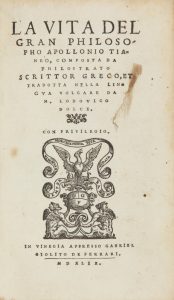 Philostratus Flavius, La vita del gran philosopho Apollonio Tianeo [...] tradotta nella lingua volgare da M. Lodovico Dolce. In Vinegia: appresso Gabriel Giolito de Ferrari, 1549.