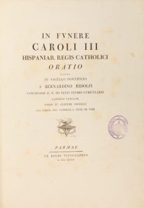 Ridolfi Bernardino, In Funere Caroli III Hispan. Regis Catholici Oratio habita in Sacello Pontificio a Bernardino Ridolfi Sanctiss. D. N. Pii Sexti intimo cubiculario Canonico vaticano, iudice et auditore generali Sac. Congr. rev. fabricae S. Petri...