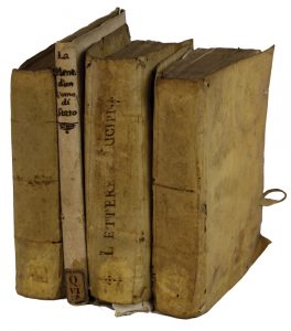 3 volumi in-4° (mm 205x150). Carte [32], 247, 1 bianca; [6], 257, [1] di marca; [8], 278 [i.e. 280], [8]. Errori nella numerazione delle carte e ripetuto il fascicolo 2K nel secondo tomo. Primo volume con strappetti, mancanze e fori di tarlo ai fascicoli a e b, altri lavori di tarlo marginali; tarli anche al terzo volume, talvolta con perdita di lettere di testo. Legatura coeva in piena pergamena floscia muta. Mancanze, parzialmente slegata in tutti i volumi. Una nota di possesso manoscritta al frontespizio del primo volume. SI AGGIUNGE: Berolino Stefano, La mente d'un uomo di stato [...] seconda edizione. Losanna: s.e., 1771. In-8° (mm 230x155). Pagine [2], LXXXXII, [1], 1 bianca. Esemplare in barbe, parzialmente intonso, stampato su carta forte. Legatura in cartonato originale con titolo e precedente collocazione manoscritti al dorso. (4). I opera: «Raccolta pregevolissima» (Gamba 434) di lettere scritte da e per uomini illustri come Baldassarre Castiglione, Carlo V, Cosimo e Lorenzo de' Medici, Francesco Maria Della Rovere, Ferrante Gonzaga e molti altri ad opera di Girolamo Ruscelli. L'opera vide la luce in momenti diversi: il primo volume venne stampato da Ziletti nel 1562, il secondo nel 1575, il terzo nel 1577. L'esemplare da noi proposto, conforme a quello censito da Adams L-563, si compone del primo volume in quarta edizione (Toldi 1573, ritenuta la prima edizione da Adams) e del secondo e terzo in prima edizione. Cfr. inoltre Cicogna, 859.