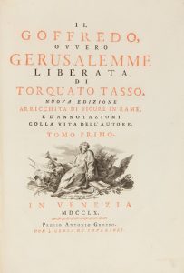 Tasso Torquato, Il Goffredo, ovvero Gerusalemme liberata [...]. Nuova edizione. Arricchita con figure in rame, e d'annotazioni con la vita dell'autore. Tomo primo (-secondo). In Venetia: Presso Antonio Groppo, 1760.