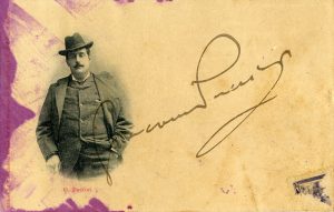 Puccini Giacomo, Firma autografa su cartolina non viaggiata. Non datata.