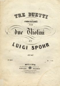 SI AGGIUNGE: Spohr Luigi, Tre Duetti concertanti per due violini Op. 67. Milano: Giovanni Ricordi. Numero di lastra 3657 (timbro a secco Tito Ricordi, giugno 1860). Parti staccate. Una firma di appartenenza alla brossura. Brossura dell'epoca. SI AGGIUNGE: Mayseder Joseph, Rondeau favorito per violino [...] con accompagnamento di pianoforte. Firenze: Cipriani, s.a. Numero di lastra 239. Parti staccate. Nome di antica appartenenza al frontespizio. Cartonatura dell'epoca. SI AGGIUNGE: Romersi Giovanni, Trio per due Violini e Violoncello ... Op. 6.ta. Milano: presso Luigi Bertuzzi, [1820 ca.]. Parti staccate. Cartonatura dell'epoca. SI AGGIUNGE: Zach Jan, Variazioni per violino con accompagnamento di Pianoforte. Milano: Lucca, [1829]. Numero di lastra 204. Parti staccate. Cartonatura dell'epoca. (5). III DOCUMENTO: Mayseder fu violinista e compositore. Fece parte del celebre quartetto Schuppanzigh (grande amico di Beethoven) e divenne virtuoso di camera a corte a Vienna. Fu apprezzato da Paganini.