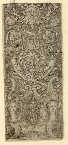 Heinrich Aldegrever, Fregio ornamentale con mascherone, due cornucopie e sfingi. 1552