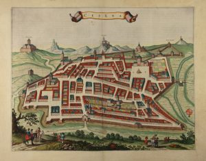 Incisione in rame in coloritura coeva. mm 420x535. Foglio: mm 565x665. Titolo entro cartiglio in alto al centro, sotto la pianta della città personaggi nei costumi d'epoca. Lieve gora d'acqua nel margine superiore che non tocca il testo, consueta piega centrale. Al verso testo in latino. Buona conservazione generale e buona coloritura. Tratta da Civitates Ecclesiastici,Theatrum Civitatum et admirandorum Italiae, 1663. Bella pianta prospettiva della città di Cesena.