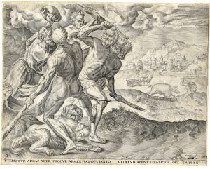 Cornelis Cort, Sternitur arca saper, procul armentoque opulento ceditub abducto Geryon ore triplex. Ercole e i buoi di Gerione. 1563