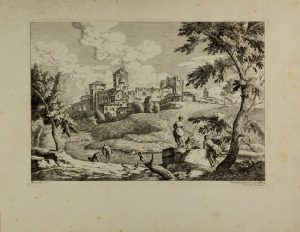 Acquaforte e bulino. mm 255x365. Foglio: mm 363x455. Succi, 209/219. Undicesima tavola dalla III serie di Quarantotto paesaggi da Marco Ricci. Il foglio in esame proviene dalla II edizione pubblicata nel 1775 da Teodoro Viero e comprendente quarantotto tavole divise in quattro gruppi di dodici stampe numerate I,II,III,IV seguite dal progressivo da 1 a 12, e precedute da quattro diversi frontespizi. Bellissima impressione su carta vergellata con filigrana “balestra” e contromarca. Pieni margini, traccia di sporadiche e lievi fioriture altrimenti conservazione ottima.