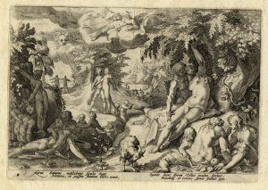 Bulino. mm 178x255. Foglio: mm 229x315. NHD (Goltzius), 534. Terza tavola della serie. Prima delle tre tavole proposte, tratte dal I libro delle Metamorfosi di Ovidio, raccolta di 20 incisioni numerate pubblicate in due edizioni, la prima a cura dello stesso Goltzius uscita ad Haarlem nel 1589, e la seconda a cura di Claes Jansz Visscher uscita ad Amsterdam prima del 1652. Questi primi venti fogli furono dunque incisi nella sua bottega nel 1589, ed i seguenti venti facenti parte del II libro, nel 1590. NHD (Goltzius) 532-551.