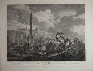 Bulino. mm 373x470. Foglio: mm 450x580. Grande incisione da un dipinto di Nicolaes Berchem (Haarlem ottobre 1620 – Amsterdam 1683), firmata in basso a destra. Al verso marchio della collezione Bullinger (Lugt 3292 Supplement). Bella prova dal forte impatto decorativo, stampata su carta vergellata priva di filigrana. Ampi margini originari con tracce di polvere. Piccolo strappo al margine superiore, minime fioriture al verso, altrimenti conservazione ottima.