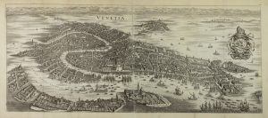 Incisione in rame su due fogli congiunti. mm 305x715. Foglio: mm 337x762. Titolo in alto a sinistra; in basso a sinistra indicazione dell'Autore. Minimi restauri marginali, angolo sinistro con aggiunta di carta coeva, lievi strappetti nei margini e alla piega centrale. ma complessivamente in ottimo stato di conservazione. Bella pianta prospettiva della città con le isole principali, presumibilmente tratta da Itinerarium Italiae, opera edita da Martin Zeiller a Francoforte nel 1640.