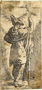 Acquaforte. mm 133x63. Bartsch, 4. Le Blanc, 20. TIB 1979, 4(20). Landau Parshall, p. 271. Mussini De Rubeis, 45. L'incisione è tratta da un disegno del Parmigianino, oggi perduto, appartenente alla serie dei Dodici Apostoli. In controparte rispetto al nostro esemplare si conta la traduzione di Andrea Schiavone (TIB 32, 1979, 27(54)), e nello stesso verso, a chiaroscuro, quella di Anton Maria Zanetti (Bartsch, 12). SI AGGIUNGE: Monogrammista FP (da) (attivo 1530-1550 ca.), San Filippo. Bulino. mm 116x83. Cfr. Mussini De Rubeis, 48. SI AGGIUNGE: Id., San Giacomo minore. Bulino. mm 110x68. Cfr. Mussini De Rubeis, 48. SI AGGIUNGE: Anonimo incisore sec. XVII, Santo evangelista. Bulino. mm 120x85. Incollata a pieno con altre tre incisioni dal Parmigianino su vecchio supporto. (4). I opera: Buona prova ancorché smarginata, incollata a pieno con altre tre incisioni dal Parmigianino su vecchio supporto. Traccia di abrasione e ingiallimento dovuto all’incollaggio. Per il resto conservazione buona. II opera: Copia nella stessa direzione dal San Filippo del monogrammista FP. Buona prova applicata a pieno con altre tre incisioni dal Parmigianino su vecchio supporto. Buona conservazione. III opera: Copia nella stessa direzione dal San Giacomo minore del monogrammista FP. Buona prova applicata a pieno con altre tre incisioni dal Parmigianino su vecchio supporto. Buona conservazione.