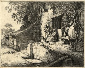 Acquaforte. mm 139x175. Foglio: mm 143x177. Godefroy, 31. Firmata e datata "Av Ostade1652" sulla lastra all'angolo sinistro. Bellissima e brillante impressione nel VI stato di VII, con la linea di inquadramento rinforzata ed i due angoli in basso completati, stampata su carta vergellata priva di filigrana. Sottili margini oltre l’impronta del rame. Al verso marchio di collezione con lettere “V.F.” entro ovale (Vicenc Furió) non su Lugt. Ai quattro angoli al verso tracce di vecchio incollaggio e in uno residui di carta. Altrimenti conservazione ottima.