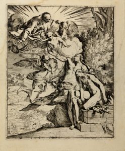 Acquaforte. mm 297x240. Foglio: mm 343x280. TIB 45/20, 2. Bellini (Testa), 26. Cropper, 71. Per l'incisione si conoscono due studi preparatori, uno conservato ad Haarlem (Teylers Museum inv. D29, Cropper, 72), ed un secondo, in controparte come il precedente, a Brema (Kunsthalle, Kupferstichkabinett, inv. 1959/32; Cropper, 71a). Come fa notare Elisabeth Cropper, l'incontrollata morsura vicino ai bordi della lastra, soprattutto vicino al bordo inferiore, gli spazi bianchi verticali che rompono i tratti incisi in orizzontale vicino l'angelo con il montone, e i graffi inchiostrati accidentalmente, appaiono in tutte le impressioni di questa stampa. Contrariamente allo studio accurato nei riguardi dell'invenzione, Testa non sembra essersi invece preoccupato di pulire e lucidare il rame. La svasatura nelle ombre scure intorno all'inguine di Isacco e nella testa dell'angelo con il montone suggerisce che il supporto non era abbastanza rigido per sostenere una morsura con molte linee lavorate accostate e vicine. Bellissima prova, stampata con inchiostrazione eccezionalmente piena e brillante, su carta vergellata con filigrana identificabile come “fiore di giglio in doppio cerchio”. Margini intonsi di 15-25 mm; al verso traccia di piega orizzontale e traccia di alone di umidità all’angolo superiore sinistro. Per il resto conservazione ottima.