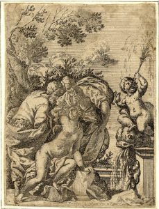 Acquaforte. mm 180x135. Davoli, 1. Firmata in basso al centro "Antonius de Trivis Inv. Et F." Bella prova su carta vergellata, applicata su vecchio supporto. Rifilata alla linea d’inquadramento interamente visibile su tre lati. Traccia di aloni nella parte alta del foglio, altrimenti conservazione molto buona.
