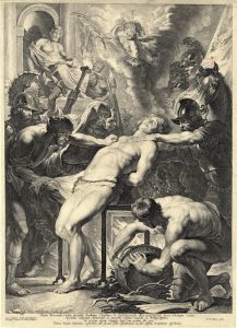 Bulino. mm 395x285. Schneevogt, 100. Hollstein, 88. Hymans, Vorsterman, 79. Rooses, 468. Wurzbach, 102, Bodart, 135. Nel margine cinque righe in latino con dedica di Rubens a Laurens Beyerlinck. In basso a sinistra firma, indirizzo e la data "1621". Rubens eseguì il dipinto dal quale è tratta l'incisione attorno al 1615 per la chiesa di Notre-Dame de la Chapelle a Bruxelles (Bellori 1672, p. 225), ed attualmente è conservato al castello di Schleissheim (inv. 338). Vi si avverte l'influenza del Martirio di San Lorenzo di Tiziano che probabilmente Rubens potè vedere direttamente sia a Venezia, nella chiesa dei Gesuiti, che all'Escorial, sia attraverso la traduzione incisoria di Cornelis Cort. Bellissima prova nel II stato su 2 dopo l’aggiunta della lettera, stampata su carta vergellata con contromarca. Margini di circa 5 mm oltre la linea d’inquadramento con impronta del rame visibile in basso. Conservazione ottima.