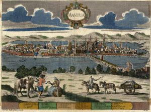 Incisione in rame in coloritura d'epoca. mm 265x360. Foglio: mm 268x395. Titolo in alto al centro su cartiglio. In basso legenda con 24 descrizioni di luoghi della città. Tracce di colla da nastro adesivo ai quattro lati che intaccano in minima parte l'inciso, ma complessivamente discreta la condizione di conservazione. Veduta della città di mantova sullo sfondo con in primo piano personaggi del tempo.
