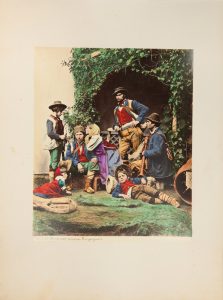In folio oblungo (mm 290x395). Con 40 tavole fotografiche all'albumina acquerellate a mano di costumi napoletani ricavati da stampe, acquarelli (Gonsalvo Carelli, Edoardo Matania ecc.) e scatti dal vero ritoccati col colore. Legatura coeva in piena tela con titolo e fregi in oro al piatto superiore. Album raro e curioso, che unisce l’oleografia al verismo aneddotico. Le fotografie all’albumina sono applicate su cartoncini e recano in basso titoli e numerazioni. Una tavola staccata, un’altra con lacuna al margine, segni d’uso alla coperta.
