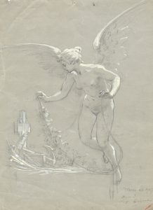 Matita nera con rialzi a gessetto bianco su carta grigia. mm 395x290. Datato in basso a destra a matita: "Genova 1907". Sotto a penna: "Dono di Luigi Brignoli (?)". Disegno di fine esecuzione, forse un'idea per un monumento funerario del cimitero monumentale di Staglieno. Non sappiamo se il nome del donatore non completamente decifrabile abbia a che fare col pittore Luigi Brignoli e se questi possa essere anche l'esecutore del disegno.