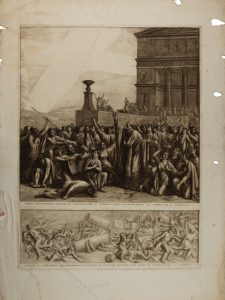 Bulino, acquaforte e acquatinta a sanguigna. mm 520x390. Foglio mm 660x485. Danni ai margini con strappetti e fori, segni di piegature e una leggera gora.