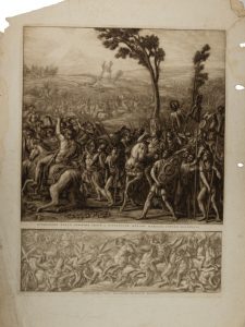 Bulino, acquaforte e acquatinta a sanguigna. mm 515x395. Foglio: mm 660x485. Margine superiore parzialmente mutilo, strappetti e fori ai margini con lievi gore.