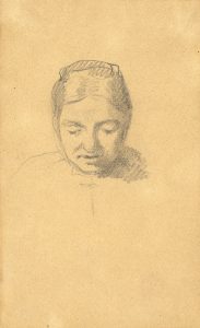 Matita di grafite. mm 210x230. Eseguito al verso di una ricevuta dei Grand Magasins du Louvre a M. me Balestrieri in data 4 marzo 1900. SI AGGIUNGE: Michele Gordigiani (Firenze 1835 – 1909),Testa femminile. Matita di grafite. mm 165x100. (2). I opera: Tracce di pieghe, un segno di colla da scotch, incollato con adesivo a passe-partout; II opera: Applicato a cartoncino.