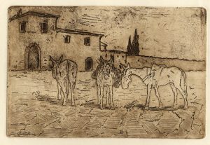 Acquaforte. mm 155x225. Foglio: mm 330x490. Firmata sulla lastra in basso a sinistra. Bellissima impressione in seppia stampata con effetto plate-tone su carta calcografica avorio. Grandi margini, ottima conservazione.