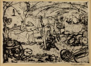 Acquaforte. mm 248x348. Foglio: mm 325x420. Marino, 1193. Luigi Bartolini. Gli esemplari unici o rari, 212 (es. 1/50). Firmata e datata in basso sulla lastra. Firma sulla lastra ripetuta in alto a destra. Firmata a matita in basso a destra. Esemplare che non reca né titolo, né tiratura. Opera esposta nella galleria "La saletta" di Modena, dal 24 novembre al 2 dicembre 1949 (in Trenta acqueforti inedite di Luigi Bartolini). Splendida impressione stampata con fresca e profonda inchiostrazione su carta Cina applicata. Ampi margini, lievi tracce di ossidazione da vecchio montaggio, per il resto ottima conservazione.