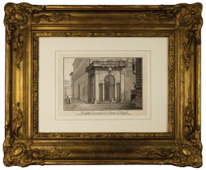 Penna e inchiostro acquerellato monocromo. mm 160x215 ca. In basso a penna: "Loggetta Tornaquinci in Firenze. E. Burci f.". In cornice oro decorata.