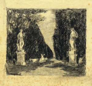 Matita nera su carta grigia. mm 255x300. Firmato a penna in basso a sinistra. Fioriture ai margini.
