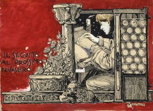 Penna, inchiostro di china,acquarello rosso e biacca. mm 130x180. Firmato in basso a destra e dedicato al verso in data 1911. llustratore per l'editoria e grafico pubblicitario. Ad inizio secolo è già direttore artistico della Tribuna Illustrata, collabora a varie testate giornalistiche come L'Avanti della Domenica, ed è copertinista per Il Giornalino della Domenica, La Lettura e Il romanzo mensile. Nel 1912 a Milano tiene dei corsi serali di pubblicità organizzati dalla Camera di Commercio; poi emigra e lavora in Svizzera, Inghilterra, Canada e Stati Uniti. Qui, tra il 1919 e 1920, lavora con la nota agenzia pubblicitaria George Ethridge & Co., dove apprende le metodologie dell'arte pubblicitaria legata alla psicologia del consumatore. Rientrato in Italia, nel 1922, fonda la propria agenzia ACME, notissima per le campagne della Rinascente, di cui lancia varie iniziative inclusa quella di inserire bar e ristorante all'interno dei locali; e poi quelle di Cirio, Fernet Branca, Cinzano, Pirelli, etc. Per lui lavora anche Marcello Dudovich.