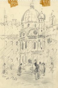Matita nera. mm 205x138. Su foglio di album taccuino. Firmato a matita in basso a sinistra: "De Pisis". Due segni evidenti di scotch nel margine superiore.