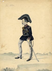 Acquarello. mm 330x245. In alto a sinistra a matita: "Gen. Ulloa". Al verso, sempre a matita: "Generale Ulloa con le truppe toscane". Piccoli fori agli angoli.