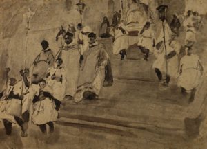 Penna, pennello e inchiostro seppia su cartone. mm 720x530. Firmato a matita in basso a destra. Timbro di Collezione Ojetti in basso a sinistra. Montato in passe-partout originale. Lievi macchioline di ossidazione sparse.