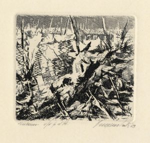 Figure. 1949. Acquaforte e acquatinta. mm 340x240. Foglio: 500x350. Firmata, datata e annotata "p. d. a.". Girasoli. 1963. Acquaforte e vernice molle. mm 290x210. Foglio mm 495x345. Firmata, datata e numerata "8/30". (Paesaggio). 1963. Acquaforte mm 140x155. Foglio mm 495x345. Firmata, datata e numerata "V/10 p. d. a.". (3).
