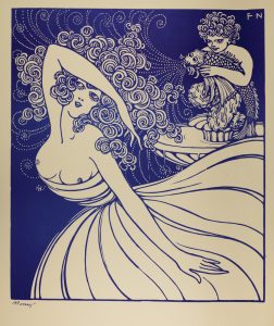 Litografia. mm 500x440. Foglio: mm 700x500. Iniziali "FN" in alto a destra nella matrice. Firmata a penna in basso a sinistra. Felice ripresa di un tema déco databile agli anni '50. Stampata a Faenza dalla Litografica S.p.A. Perfetto esemplare.