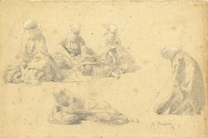 Matita di grafite. mm 260x400. Firmato a matita in basso a destra. Incollato su vecchio supporto di carta. Lievi ingialliture e un piccolo strappo.