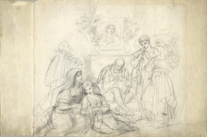 Matita di grafite. mm 230x260 (parte figurata), mm 245x360 (foglio). Margine superiore tagliato irregolarmente, piega del foglio all’estremità sinistra del disegno.
