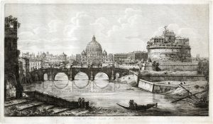Acquaforte. mm 215x330. Foglio: mm 330x470. Titolo in basso al centro. ai lati "Rossini f. – Roma". Rappresenta il Ponte e il Castel Sant'Angelo in Roma con San Pietro sullo sfondo. Incisa da Luigi Rossini, architetto, pittore e acquafortista. Allievo dell'Accademia di Bologna. Ha inciso numerose raccolte di stampe le più importanti delle quali sono: "Le vedute di Roma" raccolta di 101 rami, "Viaggio da Roma a Napoli" splendida serie delle più belle vedute che si incontrano percorrendo l'Appia da Roma a Napoli, "I sette colli" monumentale opera sui sette colli di Roma ed altre. Piccole mancanze al margine superiore.