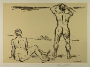 Litografia a due colori. mm 370x518. Foglio: mm 455x650. Bartolini (Soffici), LXIX. Firmata a matita e sulla matrice e numerata «74/125». Edita da Edizioni d'Arte Il Bisonte a Firenze nel 1960 e stampata da Rodolfo Margheri in unica tiratura a 125 esemplari numerati e firmati per la cartella 6 litografie di Soffici. Stato unico. In passe-partout.