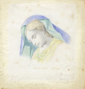 Matite colorate. mm 310x295. Firmato a matita in basso a destra. Un piccolo foro di tarlo nella parte bianca del foglio, insignificanti macchie. Incollato su cartone di supporto.