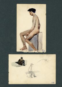 Acquarello su foglio di taccuino. mm 156x96. SI AGGIUNGE: Id., Schizzi di figure. Matita nera e acquarello su foglio di taccuino. mm 96x156. Montati assieme in passe-partout. (2).