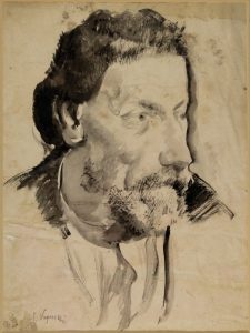 Penna e inchiostro acquarellato su carta avorio filigranata. mm 380x280. Firmato a matita in basso a sinistra. timbro a secco Eredi Vagnetti sul foglio ripetuto al verso del passe-partout in una scheda descrittiva del soggetto. Grinze nella carta, in passe-partout.