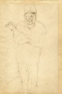1) Un pazzo. 1934 ca. Penna a inchiostro bruno su carta avorio. mm 335x235. Firmato in basso a sinistra. 2) Id., Volto di uno con cappello. Penna a inchiostro bruno su carta avorio mm 150x140. Firmato "Lorenzo" (?) in b. a d. Al verso firma stampigliata controfirmata per autentica da Amelio Vivaldi genero dell'artista. (2). I opera: frammenti di vecchia carta adesiva al verso del margine superiore; II opera: carta ingiallita, segni di colla da scotch al margine superiore.