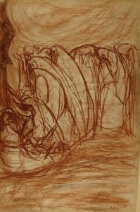 Matita sanguigna. mm 485x310. Firmato a matita "Carlo Zocchi". Al retro altri studi per il medesimo soggetto. Interessante disegno di gusto simbolista che appare ispirato alla grafica di Gaetano Previati. Poco si conosce della fase artistica iniziale di Carlo Zocchi, dedita allo studio del Trecento e Quattrocento italiano e influenzata dal Divisionismo lombardo.