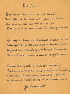 Joe Bousquet. Poème autographe signé, Petit^our ; 1 page petit in-8. Beau poème de trois quatrains. « Pour fermer les yeux du rêve en allé Dont elle est la sœur aux paupières closes Une rose est née au nid d’une rose Il n’est plus de...